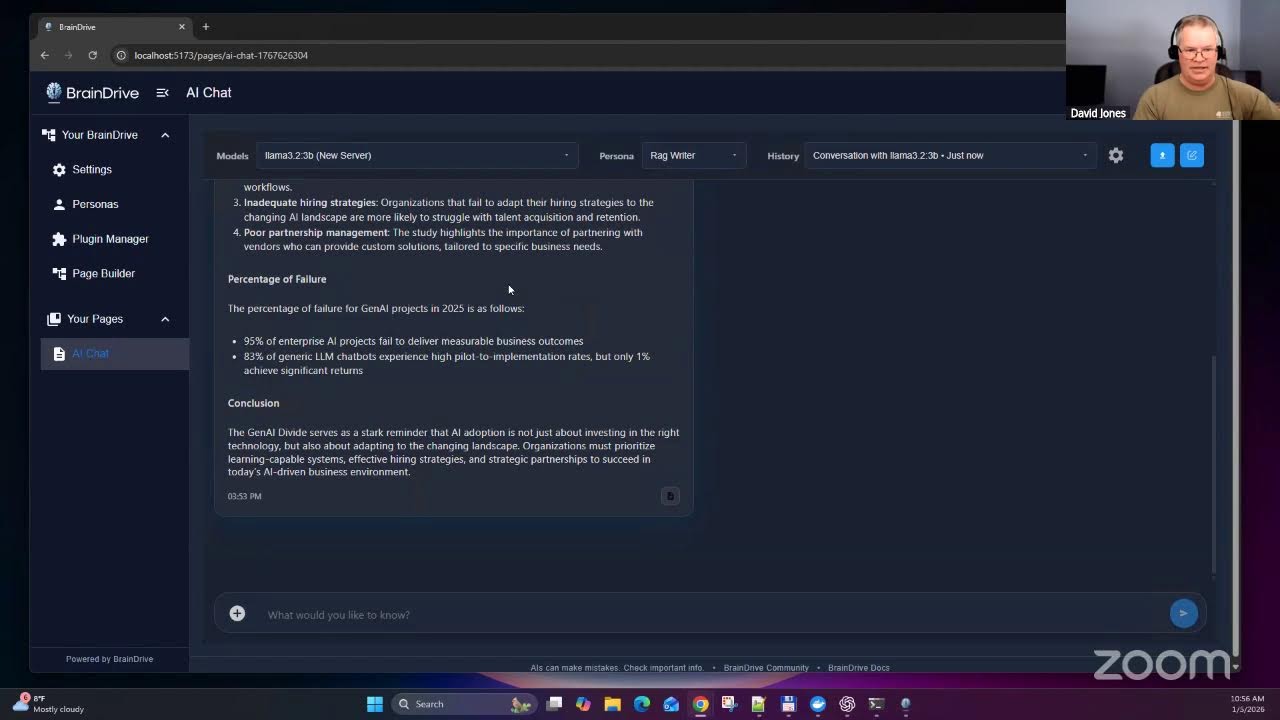 - Document Chat in Action: Dave J demonstrated uploading both Markdown files and PDFs The system parsed a 26-page document with tables in under a minute, providing grounded answers nearly as fast as a standard chat query.