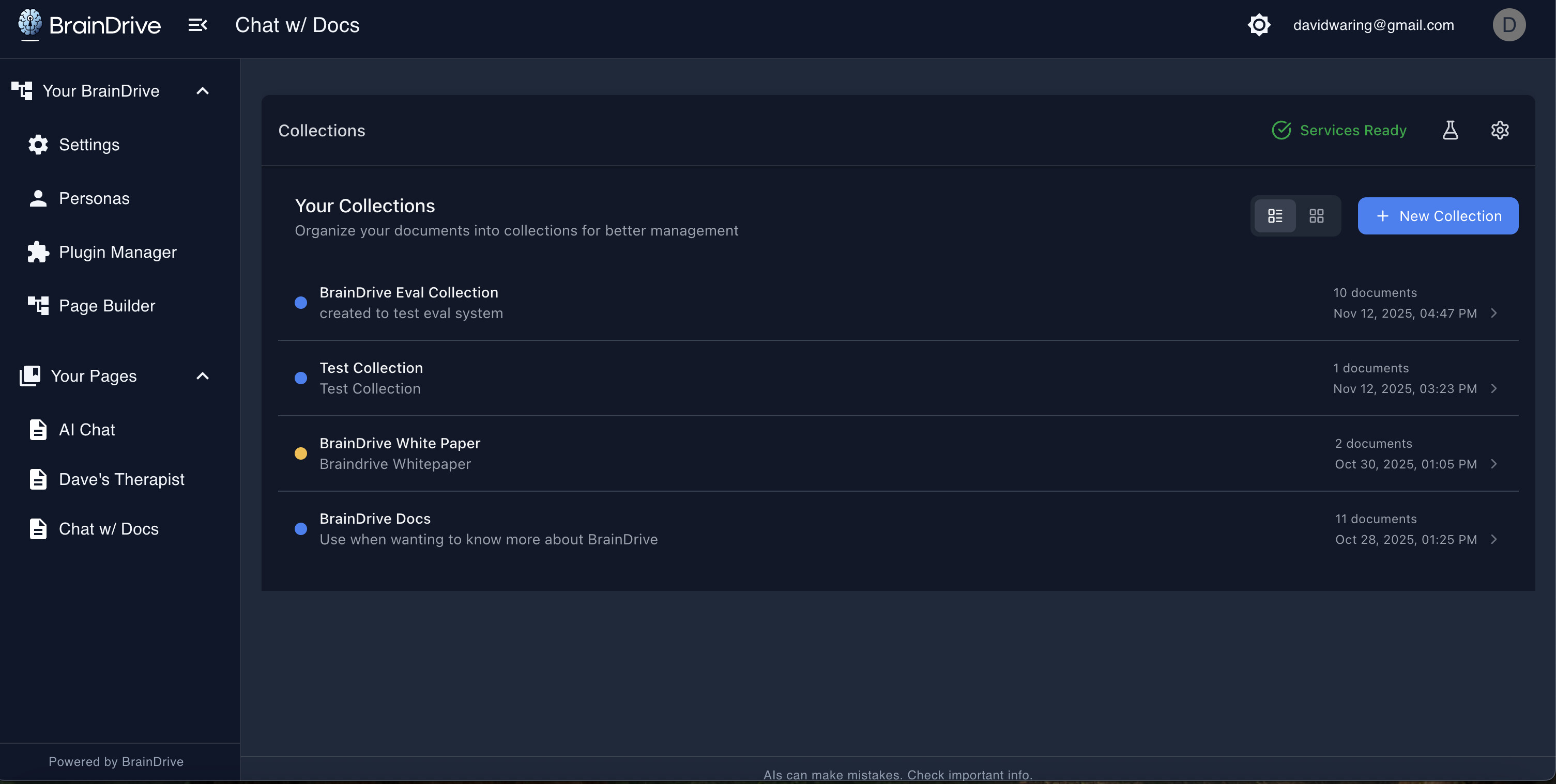 This plugin provides a complete document chat interface within BrainDrive. Upload documents, organize them into collections, and chat with AI about their contents—all processed locally on your machine.
