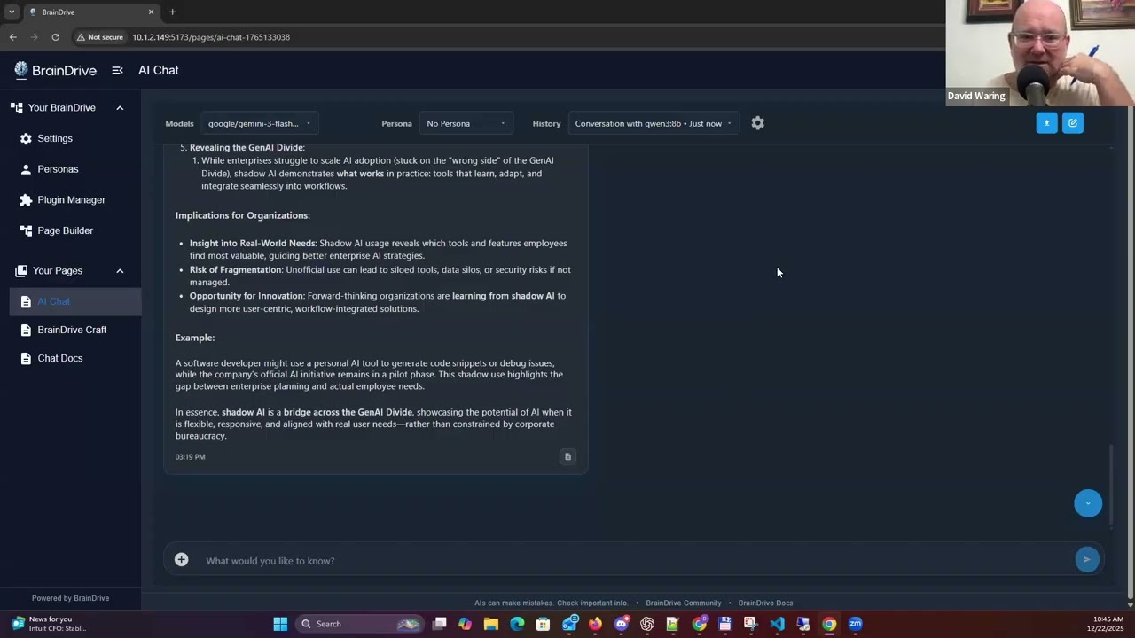 BrainDrive Owners should be able to answer these questions at a glance: What model am I using? What persona is active? What mode is enabled (RAG, doc chat, collection)? What context is being applied?